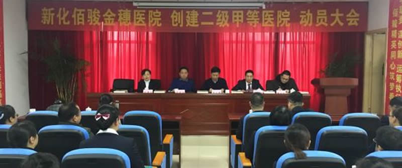 2019年3月1日下午,新化佰骏金穗医院隆重的召开了创建二级甲等医院动员大会,这是新化佰骏金穗医院一个新的起点,同时也是我们佰骏医疗集团一个新的起点。医院所有中层以上管理干部参加会议,出席会议并在主席台就坐的嘉宾和领导有新化县人民医院医务科科长黄立平、佰骏医疗集团副总经理谢立新、新化佰骏金穗医院副董事长曾建煌、新化佰骏金穗医院总经理欧阳昌松、新化佰骏金穗医院工会主席刘满云。