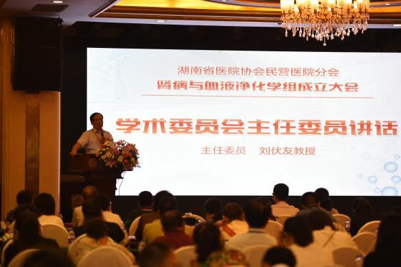 会议由湖南省医院协会民营医院分会办公室主任刘伟军先生主持。湖南省佰骏高科医疗投资管理有限公司副总经理谢立新代表会议筹备组做了筹备工作情况汇报;湖南省医院协会民营医院分会组织工作部常艳主任宣读了《关于同意成立肾病与血液净化学组的批复》;接着选举产生了学组主任、副主任、秘书及委员,并颁发了荣誉证书;同时宣读了学术委员会成员名单,湘雅二医院原党委书记、国内知名肾病专家刘伏友教授亲自担任主任委员;期间新当选学组主任李军教授上台接受聘任并发表致辞。