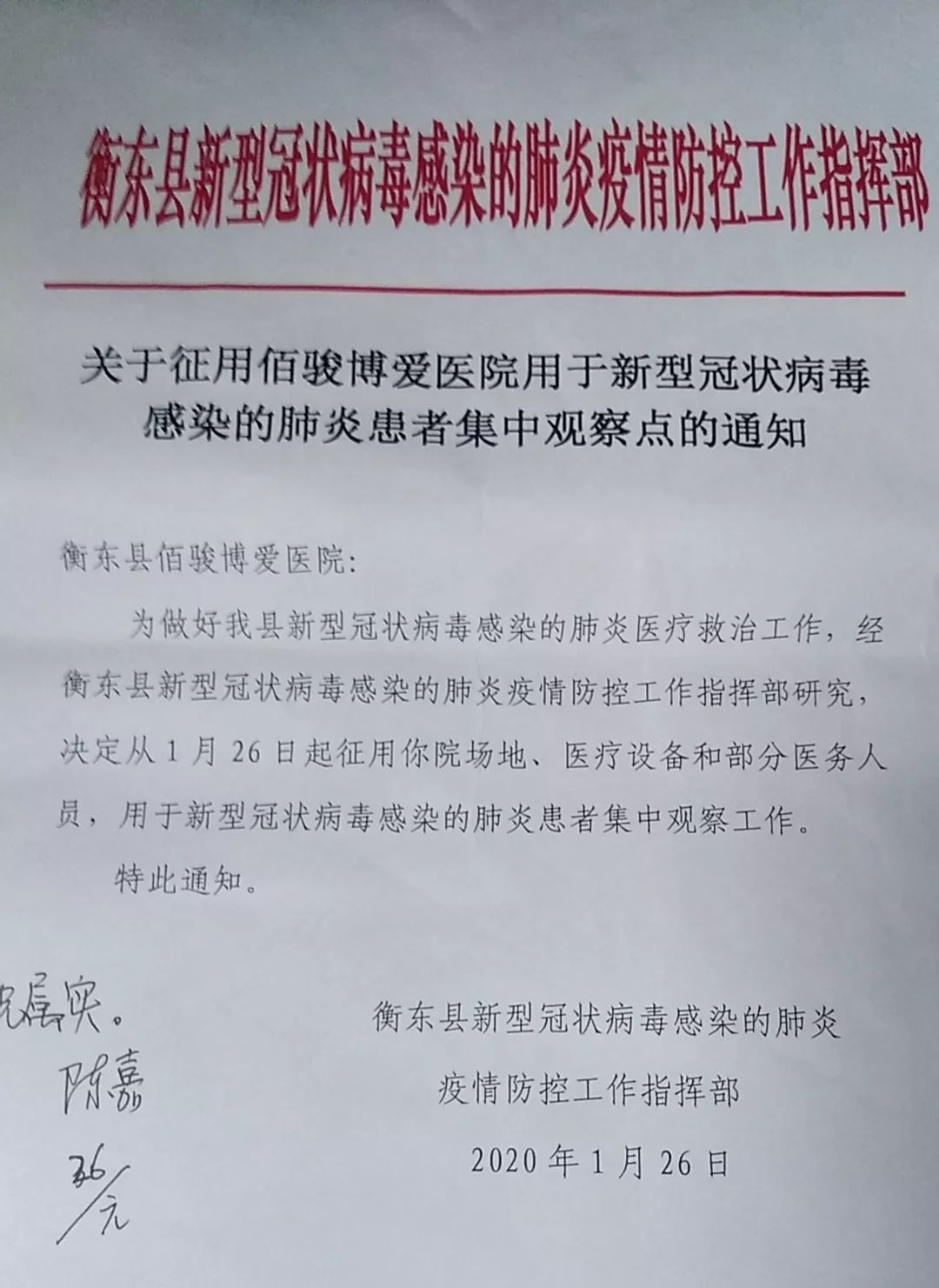 2020年1月26日,为加强衡东县新型冠状病毒感染的肺炎疫情防控工作指挥部征用湖南省佰骏医疗集团——衡东佰骏博爱医院用于新型冠状病毒感染的肺炎患者集中观察点。