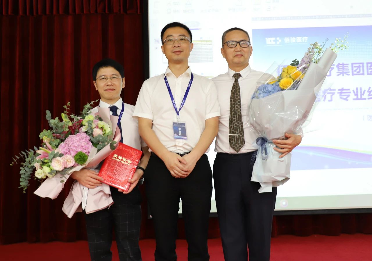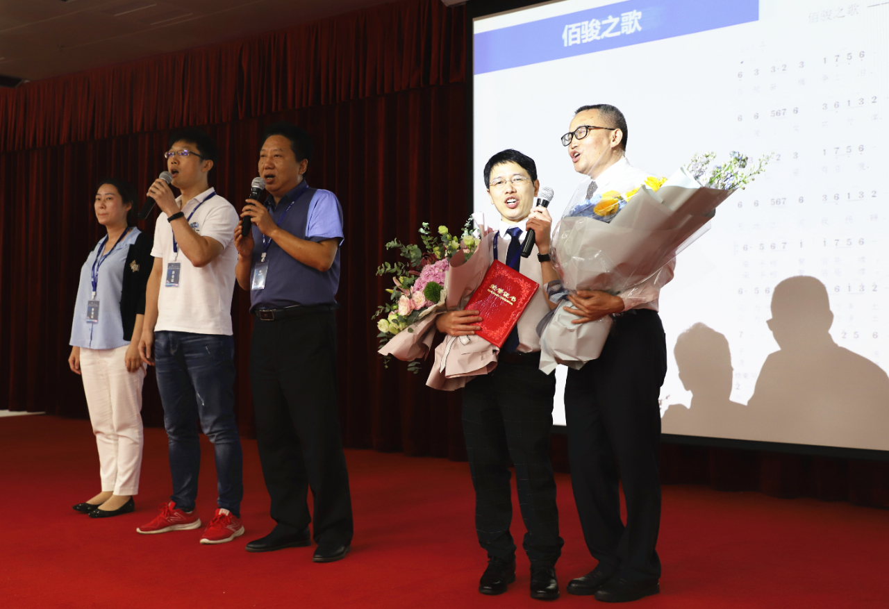 ▲佰骏医疗集团司歌《佰骏之歌—守护一方净土》发布会,公司员工、词曲作者邓鸿宾(左)荣获特别贡献奖