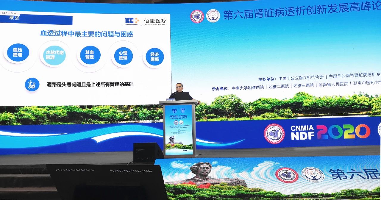 9月5日上午,论坛血管通路专场,中南大学湘雅二医院教授、湖南省医院协会民营医院分会肾病与血液净化学组主任委员、佰骏医疗集团肾病学术委员会主任、佰骏医疗集团血液净化质量控制委员会主任委员李军教授担任会议主席,并代表佰骏医疗集团作题为《AVF狭窄的原因与干预》的专题学术报告。