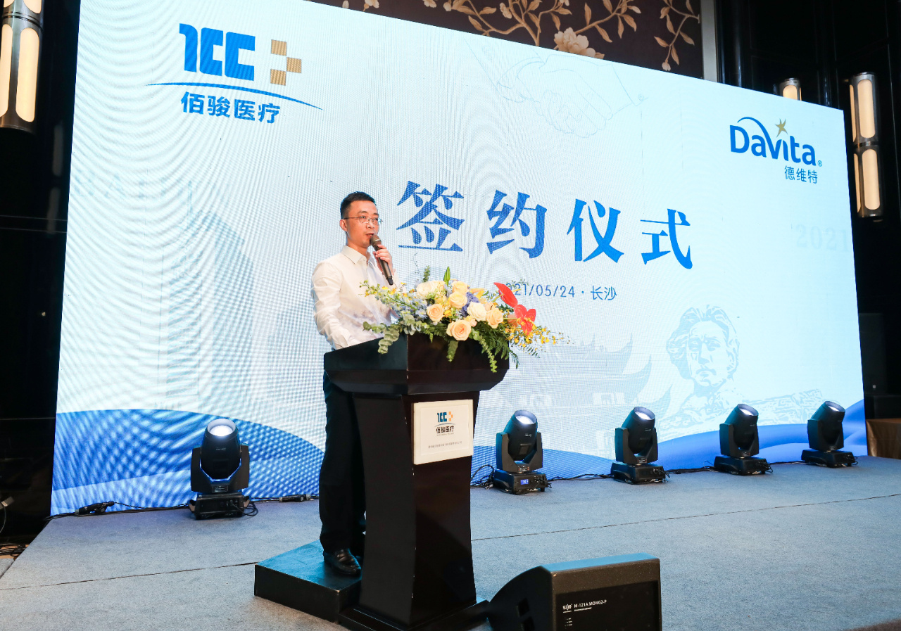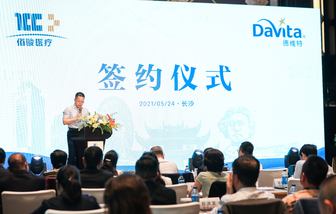 5月24日下午,湖南省佰骏高科医疗投资管理有限公司(简称“佰骏医疗”)与美国德维特公司(DaVita Inc)战略合作签约仪式在长沙瑞吉酒店隆重举行,仪式采取线上线下结合的方式进行,方盛制药董事长、佰骏医疗董事长张庆华先生,佰骏医疗创始人、总经理唐煊卫先生,DaVita国际公司总裁兼首席执行官Mr Robert Lang,亚太区总裁兼全球业务发展总监Mr Joseph Soon,高级法律顾问Mr Kelvin Leung,特别项目总监Mr Charles Yu,DaVita亚太合资公司董事会Mr Koichiro Sato,DaVita亚太合资公司董事会Mr Daisuke Fujita,湖南自贸试验区长沙片区管委会领导侯向宇先生,长沙市雨花区人民政府领导易静女士,中南大学湘雅二医院刘伏友教授,湖南省医院协会民营医院分会尹澎会长等领导和嘉宾以及其他各位知名专家、教授和各大媒体的新闻记者朋友参加了此次仪式。