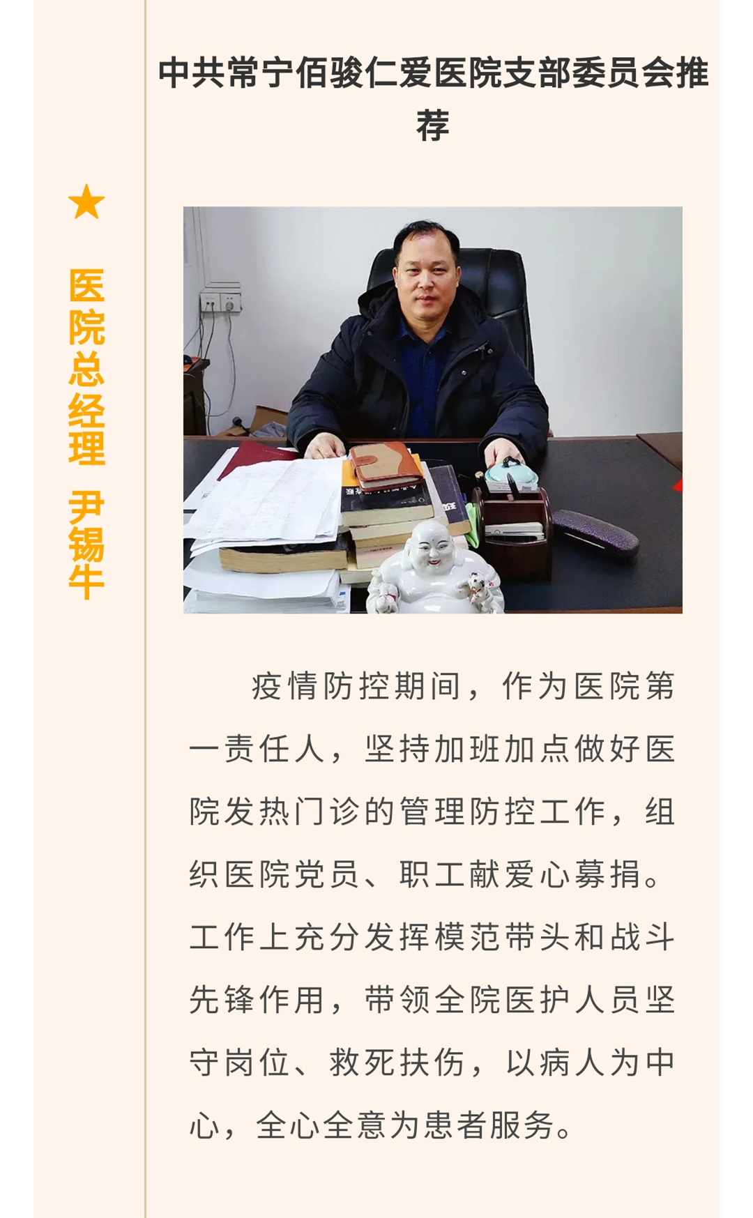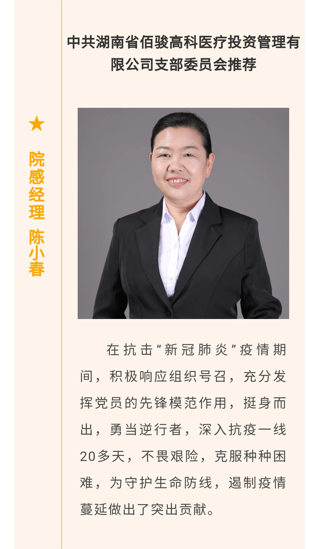 近年来,佰骏医疗集团认真贯彻落实党的十九大精神,深刻领悟新时代中国特色社会主义思想,在集团治理与经营中增强“四个意识”、坚定“四个自信”、做到“两个维护”,在此期间涌现出一大批自党遵守党章,信念坚定,对党忠诚,坚守初心,践行宗旨,勇于担当,在本职岗位上务实苦干、在服务群众中无私奉献,在医院经营、工作、学习和社会生活中起到带头发挥模范作用的优秀党员。