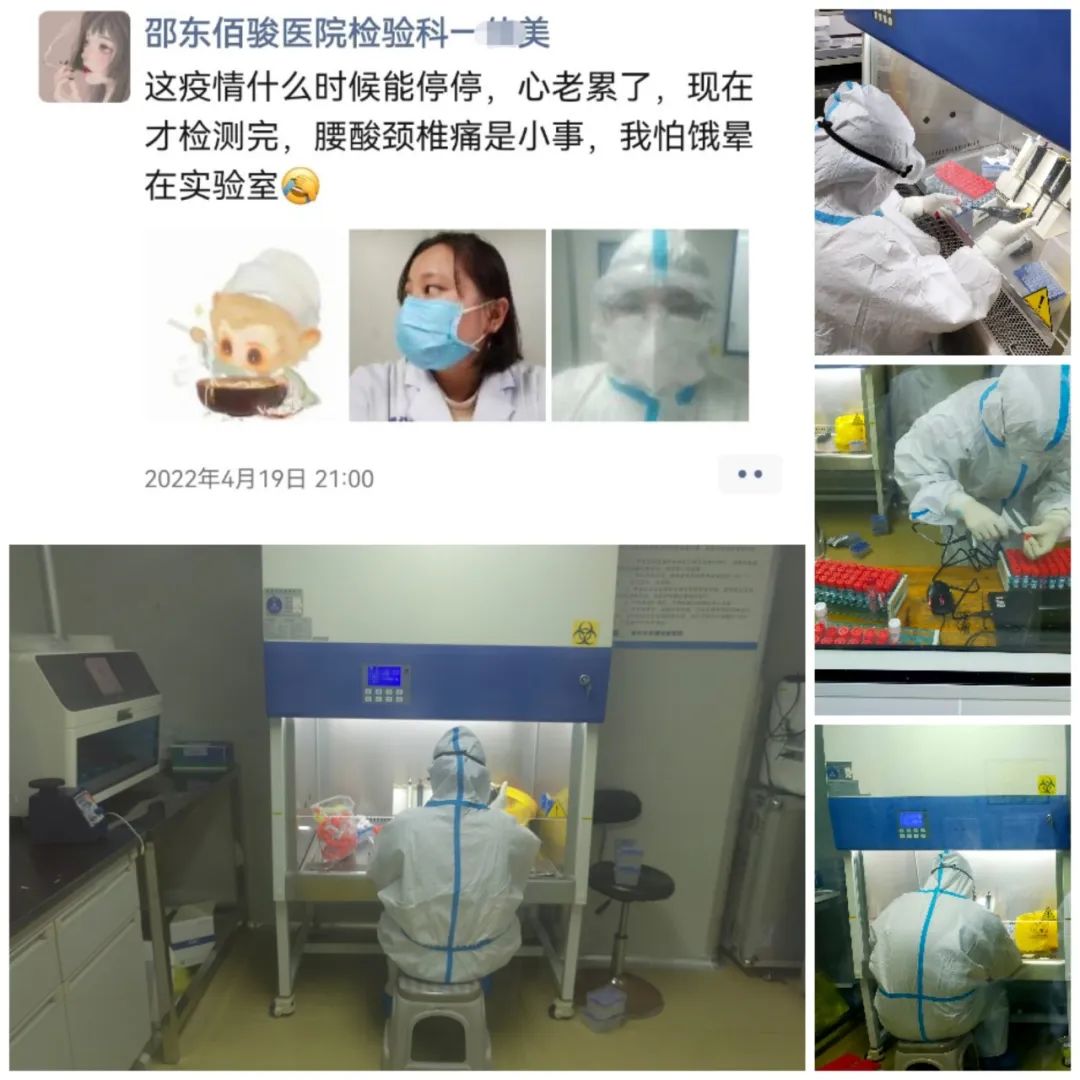 此次邵阳本土疫情,从4.18邵阳报告第一例确诊病例以来,截至4月27号,医院检验科的检测量共25264人份,单日医院最大核酸检验量达1300多管,对比以往的日常检测,工作量达六倍之多。为确保报告的及时发出,实验室里机器不停运转,科室加班成为了常态,检验人员已没有了时间概念,眼中只有一支支“排队等候检测”的试管......