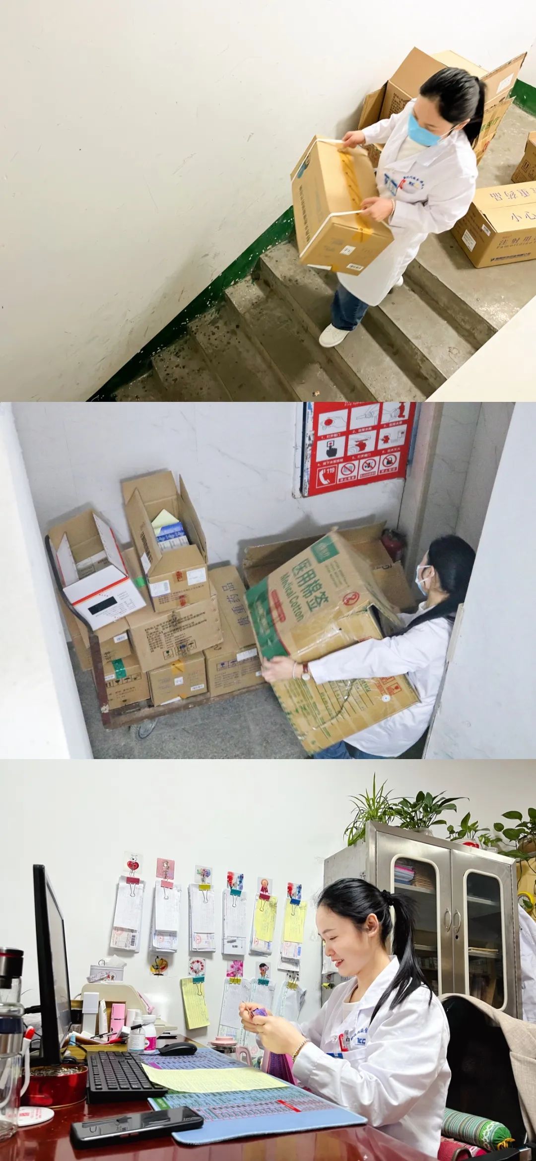 图为药剂科刘湘华正在从仓库搬运药物到临床科室。日复一日,年复一年,这是她每天早上必须完成的事,面对那么多又那么大一箱的药,她铆足干劲,保质保量将药物运送到科室。我问她:“累吗?”,她说:“我天生爱运动,就当这是一种健身。”