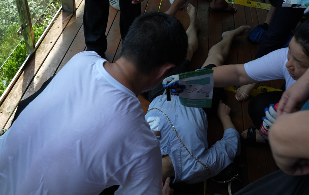 ▲佰骏医师对一例中暑游客进行现场紧急处置