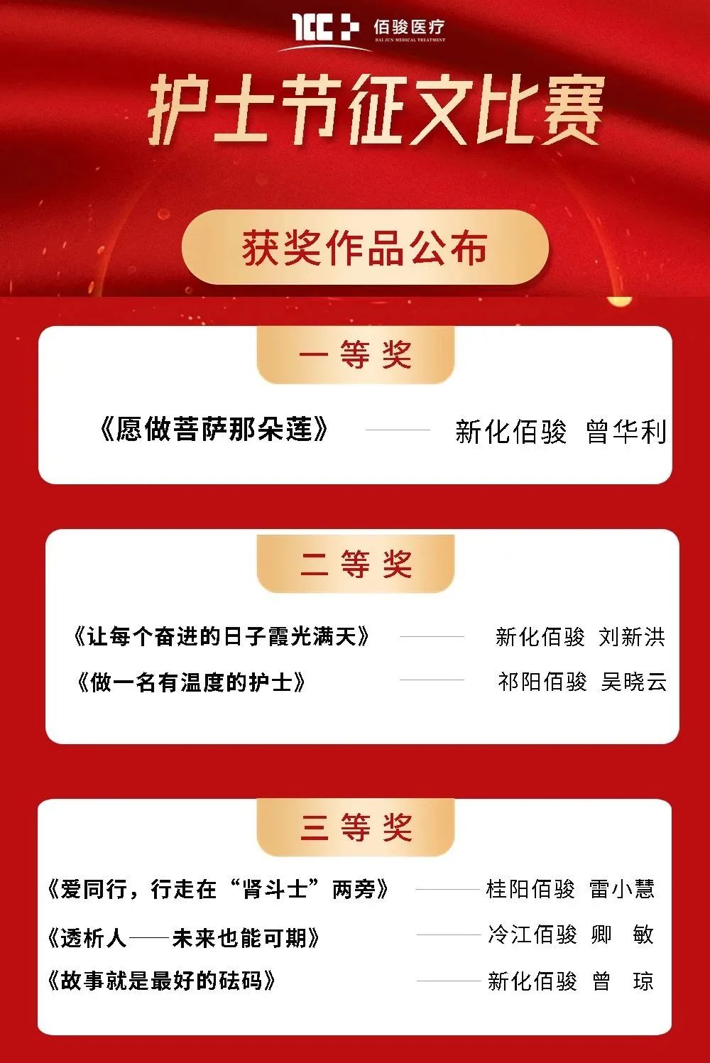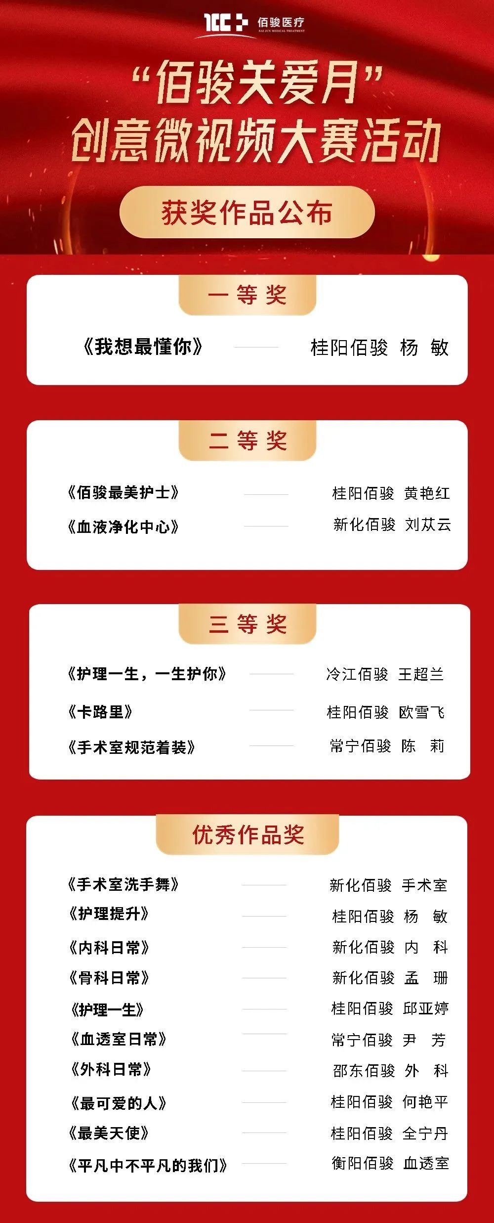 五月作为“佰骏关爱月”,由佰骏医疗集团总部组织的“佰骏关爱月”创意微视频大赛、512护士节征文大赛顺利结束,本次活动收到微视频72份、收到参赛文章43篇,通过层层筛选与评定,获奖情况如下: